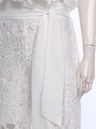 renvena Womens Chiffon Lace Outfit Floral Hollow Out Button Shirt Top Wide Leg Belted Pants 2 Piece Sets 4