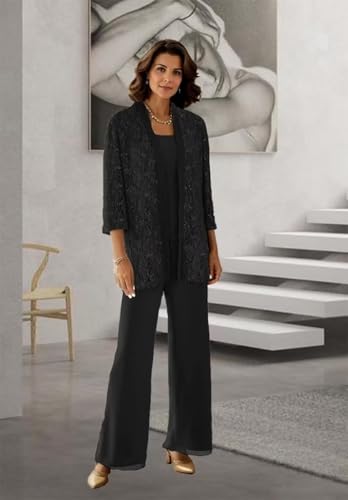 • 3 Pieces Pantsuits for Women Casual Lace Applique Mother of The Bride Dresses Pant Suits with Jackets Sparkly Sequin 3/4 Sleeve Lace Chiffon Classy Formal Pant Suits for Women Dressy Wedding Guest Pant Suits