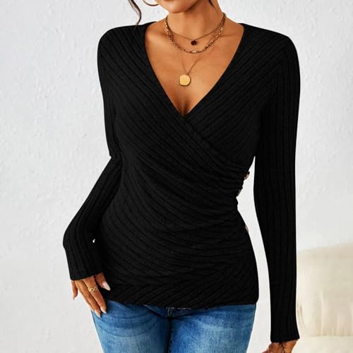 Womens Casual Knitting Tops Slim Fit V Neck Long Sleeve Button Trim Shirts Comfy Going Out Y2K Blouses for Teen Girls