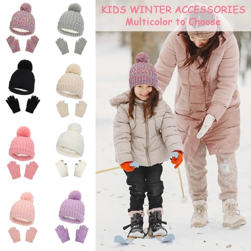 Kids Winter Hat and Gloves Set, Girl toasty Knit Beanie with Pom Fleece Lined for Toddler Boys Girls 1-6 Years