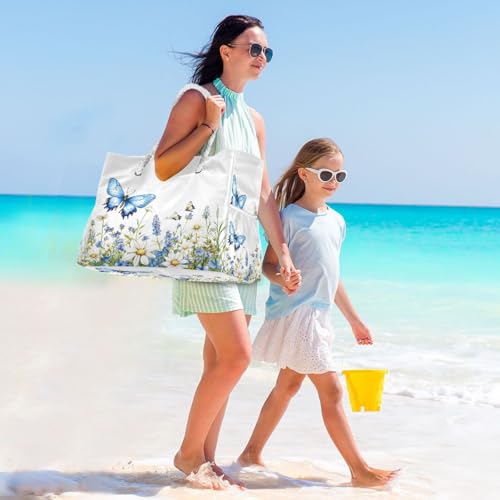 Beach Bag - Large Tote Bags for Women Blue Butterfly Flowers Shoulder Bags Zipper Waterproof Sandproof for Travel Gym Swim Daily 7