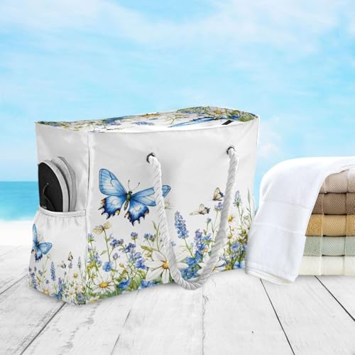 Beach Bag - Large Tote Bags for Women Blue Butterfly Flowers Shoulder Bags Zipper Waterproof Sandproof for Travel Gym Swim Daily 5