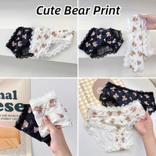 Cute Bear-printed Panties for Teen Girls Age 14-18,Lace Frilly Trim Underwear,Mid Rise Waist,Cotton Crotch,2 Pack 4
