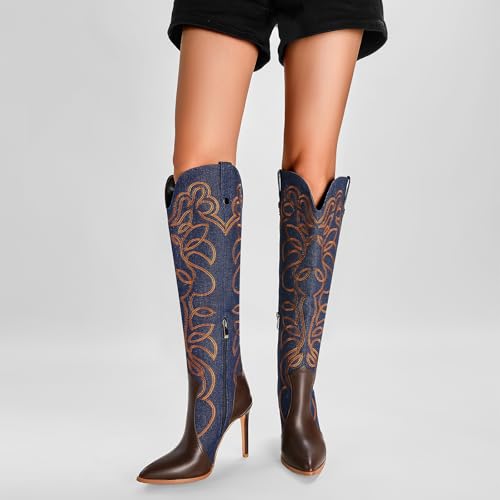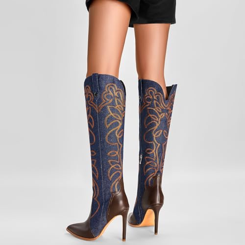 Women's Cowboy Boots Wide Calf Stiletto Knee High Fashion Pointed Toe Side Zipper High Heel Boots 6