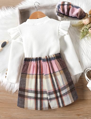 Toddler Girl Clothes,Girls Outfits Long Sleeve Ruffle Button Tops + Plaid Skirt Shorts + Hat 3Pc Little Girls Clothes 4
