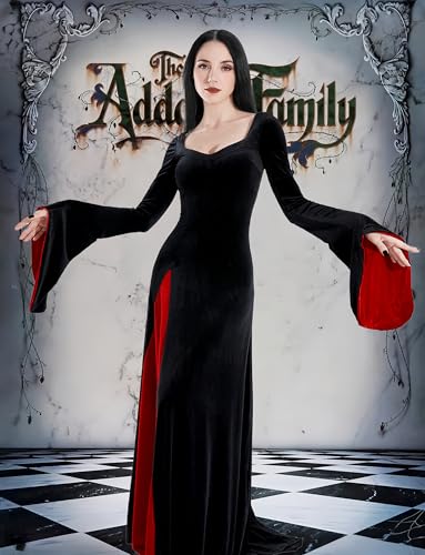 • exclusive Design: Gothic and vintage style,Morticia costume featuring black dress with Square V-neck,shows off your gorgeous sexy collarbone, long flared sleeves can trim the arms and the floor-length fishtail dress can be worn with heels to flatter your figure.Velvet fabric fit your waist better and make your figure look more perfect, hides the small belly