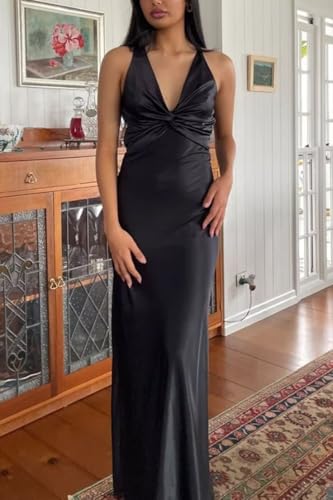 Satin Prom Dresses for Women Corset V Neck Long Silk Bridesmaid Dress