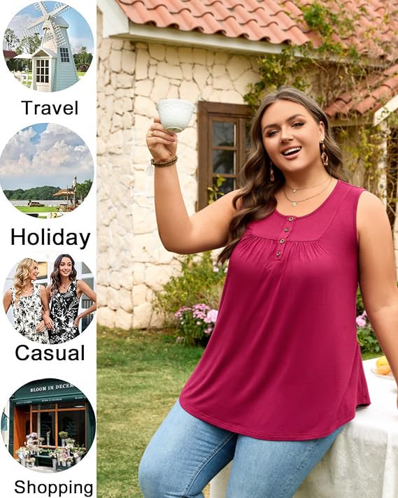 POPYOUNG Womens Summer Tank Tops Sleeveless Loose Fit Henley Button Down Shirts to Wear with Leggings Casual Pleated Blouse