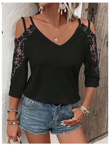 popular ! MakeMeChic Women's Guipure Lace V Neck Tee Shirts Cut Out Cold Shoulder 3/4 Sleeve Tops