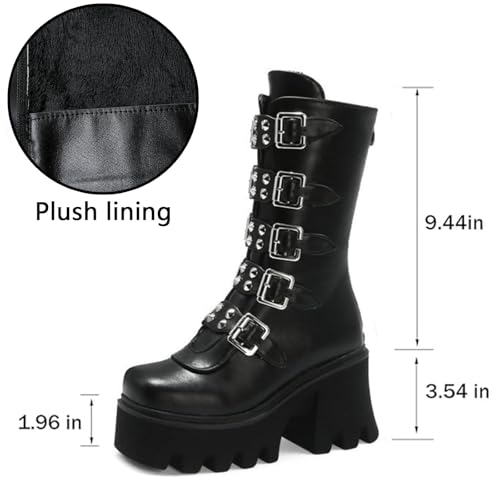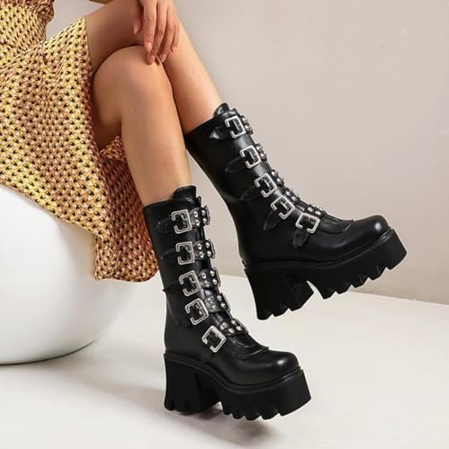 Women Platform Goth Boots Studded Mid Calf Combat Punk Boots Buckle Chunky Heel Back Zipper Thick Sole Ankle Booties 6