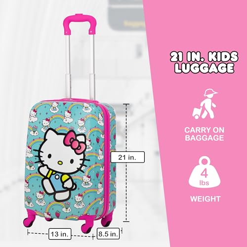 HELLO KITTY TRAVEL LUGGAGE: This cute and sleek hardshell luggage for boys and girls features Hello Kitty against a vibrant turquoise background with lovely rainbows, making this a perfect gift for the Hello Kitty fan in your life, and is perfect for all of your travel needs, with dual zippers to keep your valuables safe and secure inside; this hardshell luggage carrier meets most airline requirements for carry-on luggage and fits into most overhead binsABUNDANT STORAGE: Hard luggage features a sizable polyester-lined main zip compartment divided for easy packing of your child's personal items and essentials, and clothing compression straps to keep clothes from wrinklingEASY PORTABILITY: Children's wheeled luggage features a lightweight upright design with four 360-degree spinner wheels, and features a top carry handle for easy loading into trunks, cars and overhead bins; features a top retractable handle which allows for effortless movement during travelDURABLE: Travel luggage bags feature a hard shell polycarbonate and ABS plastic case which protects your luggage and are easy to spot clean; officially licensed Sanrio product ensures that you are receiving quality Hello Kitty hardside luggageDIMENSIONS: Kid lightweight luggage spinner suitcases measure 20.5 H x 13 W x 8.5 D in inches, and weigh 4 lbs Perfect for everyday use. first-class materials and excellent craftsmanship ensure long-lasting durability.