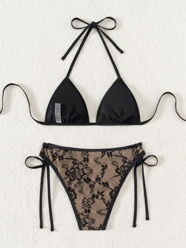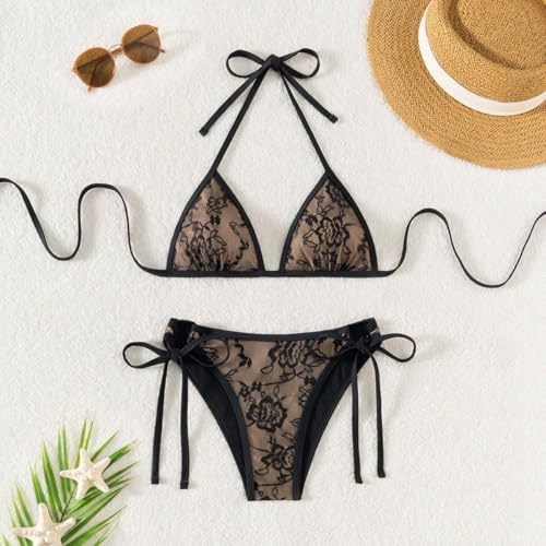 WODECASA Bikini Sets V Neck Triangle Two Piece Swimsuit Floral Lace Halter Tie Side Tie Back High Cut Sexy Bathing Suit 2