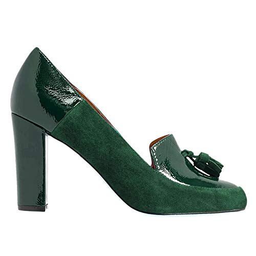 LEHOOR Women Chunky Block High Heel Fringed Pumps Round Toe, Slip On Dress Loafers with Tassel Suede Patent Leather Patchwork for Ladies Girls Office 4-15 M US 5