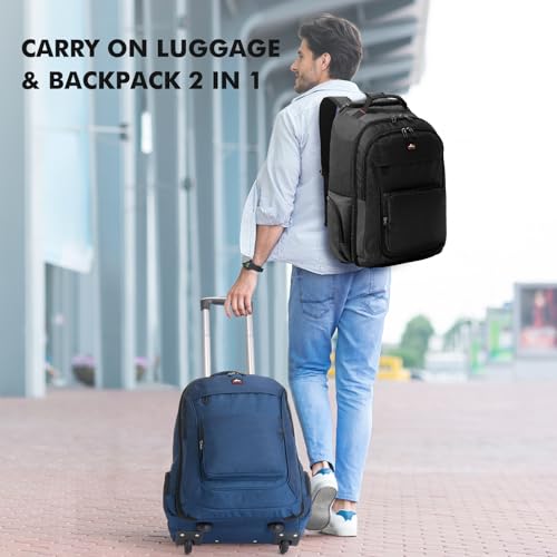 BACKPACK WITH WHEELS: Dimensions: 13.4L X 9.8W X 20H inch, Item weight: 5.4 pound. This rolling backpack for adults can freely adjust the length at your needs with19.9 inch aluminum hideaway telescoping handle. The wheeled laptop backpack is built from quality water resistant nylon material It ideal for daily use and travel.SUITCASE & BACKPACK 2 IN 1: Wheeled backpack with aluminum hideaway telescoping handle and stowable shoulder straps, you can switch between a carry on backpack and a rolling backpack. Meeting different travel usage needs. There is a pocket designed to store the shoulder straps, preventing the shoulder straps from being soiled when dragging travel laptop backpack. 2 in 1 backpack on wheels suitable for business trip, travel backpack, carry on luggage, every day use and work.MULTI-COMPARTMENTS: Travel backpack with wheels built-in separate fully-filled 17.3 inch laptop pocket secured with velcro, soft padding protects your laptop from damage. Main compartment has enough storage room hold personal items, and built-in X-shaped elastic bands to keep your clothes from falling out; The middle compartment used to place the phone, wallet, pen, etc. The front compartment can be used to store quick access items. Many pockets make your items organized and easier to find.COMFORTABLE DESIGN: Adjustable aluminum telescopic handle with two-position adjustment. The double lever handle is more sturdy and durable, making it more stable to use and preventing the backpack from shaking. Double zipper design, thicker Bottom Panel, reinforced stitched shoulder straps an carry relatively large weights. The rolling backpack is a perfect gift, great choice of large rolling backpack, travel backpack with wheels, business backpack with wheels.DURABLE MATERIAL: Rolling backpack carry on luggage shoulder straps with sturdy plastic hook to adjust the length of the shoulder strap to fit your body. The X-shaped elastic band effectively fixes the contents of the bag while carrying. The rubber wheels at the bottom are not easy to wear and the rotation is smooth. Two-sides zipper pockets can hold water bottles or umbrellas. Use it as an airplane travel bag, weekender bag, carry on backpack and laptop backpack. Perfect for everyday use. High quality materials and excellent craftsmanship ensure long-lasting durability.