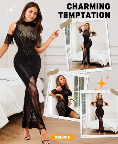 RSLOVE Women Lingerie Sexy Dress - Lace Mesh Sleepwear Maxi Nightgown Exotic Sheer Long Bridal Chemise with Detachable Sleeve 5