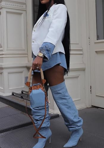 Women's Denim Blazer Jacket Casual Patchwork Long Sleeve Top Open Front Jean Jackets 4
