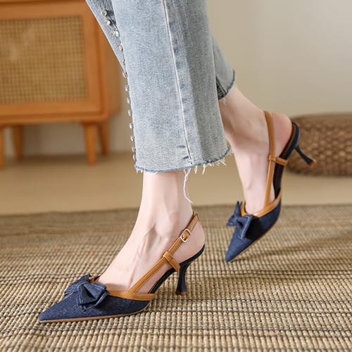Zeberfi Women's Bow Tie Denim Slingback Pumps Sexy Closed Pointed Toe Slip On Kitten Heels Sandals Summer Wedding Bride Party Dress Stiletto High Heels 6