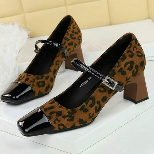 Meefit Women Leopard Mary Janes Square Toe Chunky Heel Pumps with Buckle Mid Heel Suede Mary Janes Shoes
