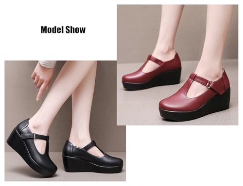 Women's Genuine Leather T-Strappy Hollow Platform Wedge Pumps Retro Adjustable Hook and Loop Round Toe supple Sole snug Mom Mary Jane Shoes for Walking Commuting Daily