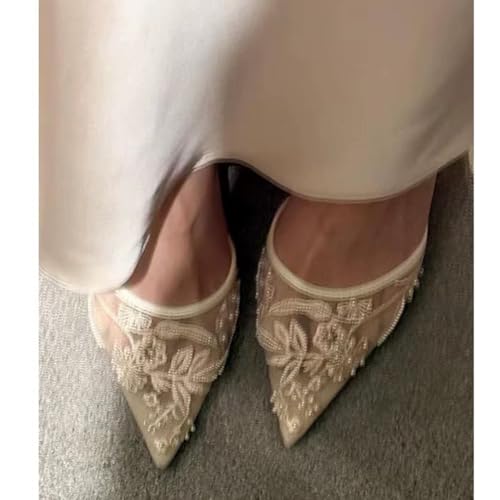 • Elegant Pearl Bridal Heels: YIYA White Embroidered Mesh Slingback Wedding Bridal Heels feature a closed pointed toe,exquisite pearl details,and embroidery, impeccable wedding shoes for bride.