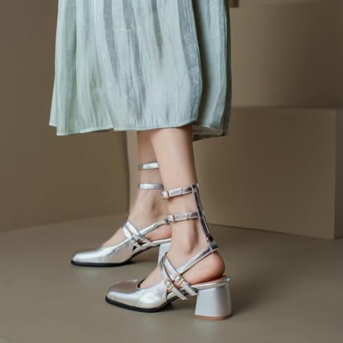 KISSASA Punk Goth Mary Jane Shoes Patent Leather Square Toe Chunky Heel Buckle Strappy Pumps Silver Size 9 4