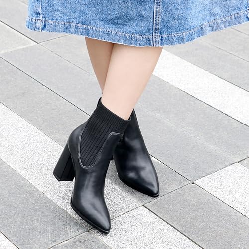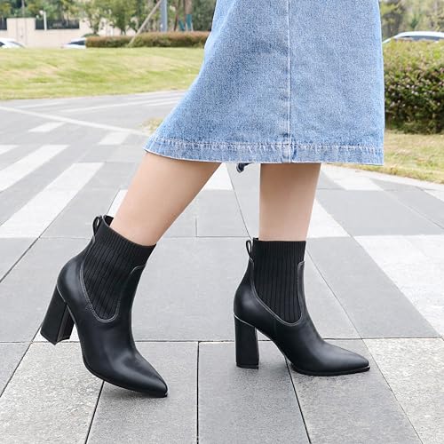 Zzheels Women's Pointed Toe Ankle Boots Knit Sock Booties Elastic Chunky Heeled Slip On Ankle Boots