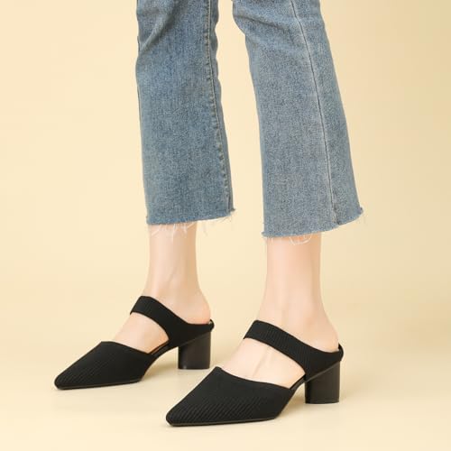 Women’s Knitted Pointed Toe Chunky Heel Mules Fashion Backless Slip On Breathable Heeled Sandals Daily Office Dress Pumps