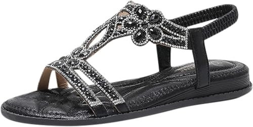 Women Rhinestone Sandals T-Strap Elastic Strap Beaded Sparkly Bling Bohemian Crystal Flat Sandal Thong Ankle Strap Summer Gladiator Sandal A-Black,7.5