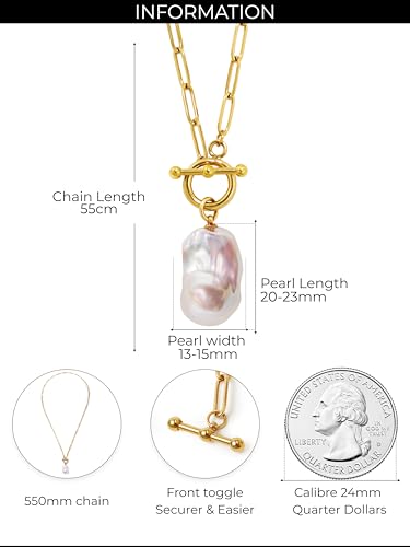 Material: Pearl, Stainless SteelMetal type: Stainless SteelClasp type: ToggleChain type: CableGem type: Pearl【PERLVOYA Chunky Toggle Paperclip Necklace with Baroque Pearl Pendant】-- This elegant necklace features a 13-15mm x 20-23mm AAAA quality Baroque pearl, offering a one-of-a-kind design. Paired with a 550mm 18K gold PVD-coated stainless steel paperclip chain, the toggle clasp ensures easy wear and secure closure, perfect for both casual and formal occasions.【Durable & Timeless Design】-- Crafted with precision, the 18K gold PVD coating ensures that the necklace retains its shine and durability over time. The Baroque pearl pendant stands out as a statement piece, complementing a variety of styles. This necklace is perfect for wearing on its own or layering with other jewelry pieces for a personalized look.【Fade-Resistant & Water-Resistant】-- The 18K gold plating is designed to be waterproof and sweat-resistant, ensuring your necklace maintains its beauty over time. While we stand behind the quality of our products, we recommend proper care to maintain its finish and shine for long-lasting wear.【Sustainability Sourcing】-- At Perlvoya, we prioritize sustainability by using recycled metals in our designs and eco-friendly, recyclable packaging. We are committed to maintaining the highest standards of ethical sourcing and craftsmanship, certified by Jewelers of America and the Better Business Bureau (BBB).【Perfect Gift for Every Occasion】-- The PERLVOYA Chunky Toggle Paperclip Necklace is an ideal gift for women on occasions such as birthdays, weddings, or anniversaries. With its timeless design, this necklace is sure to be appreciated by those who love exclusive, high-quality jewelry. Perfect for everyday use. first-class materials and excellent craftsmanship ensure long-lasting durability.