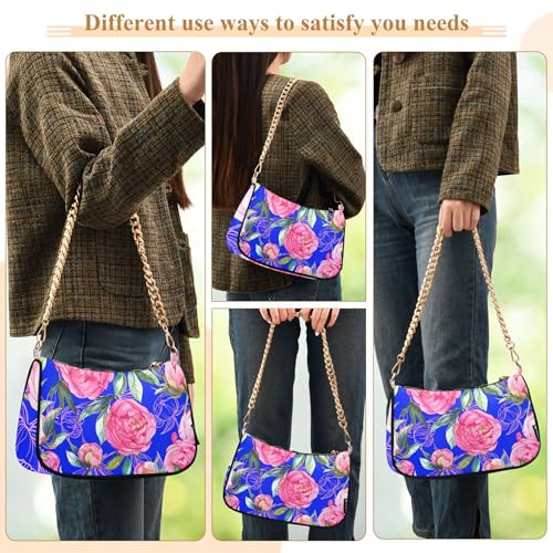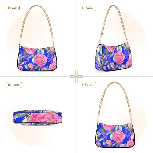 Zipper Ladies Shoulder Bag Floral Pink Peony Flowers Leaves Blue Tote Handbag Designer Womens Hobo Evening Purse with Chain Strap