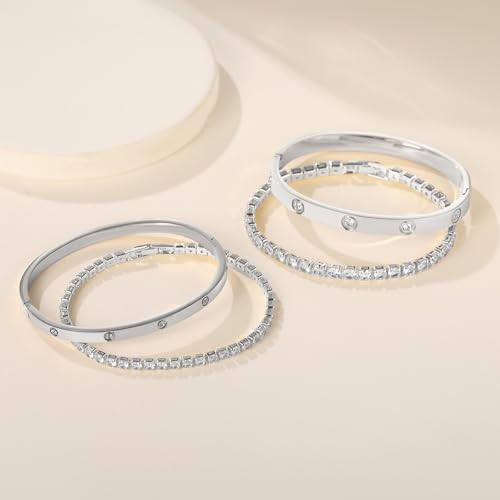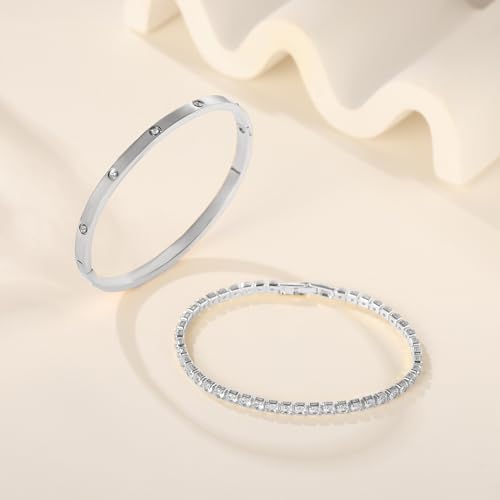 • Multi-Size Bracelet:Set includes one 4mm love bangle and one 3mm tennis bracelet,both of the bracelets are available in 6.5 inches, 7.0 inches and 7.5 inches to fit incredibly wrists.Love bangles design with hidden clasp and it is easy to wear and take off. And the tennis bracelets are design with fold-over clasp which is long-lasting and sturdy.