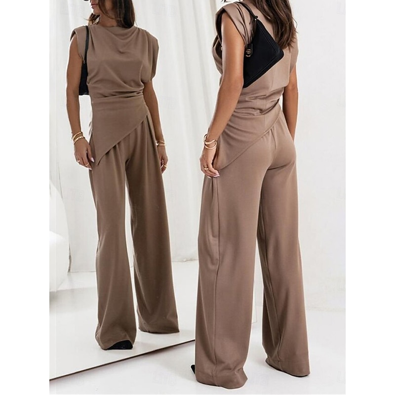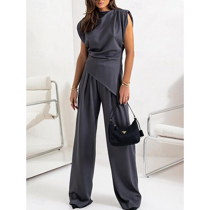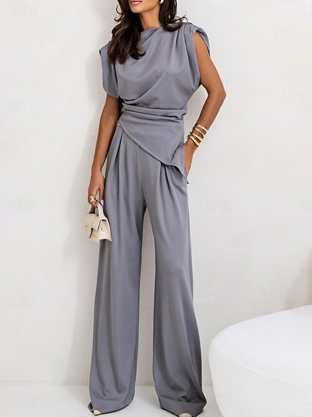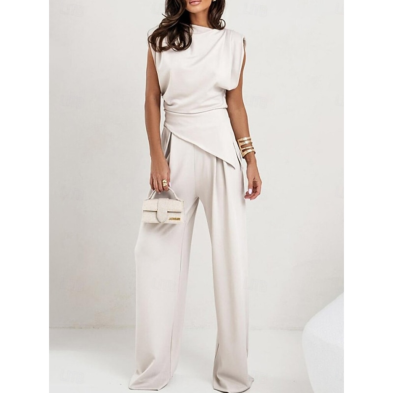 popular ! Women's Elegant Fashion Streetwear Pants Sets Sleeveless Crew Neck Solid Color Ruched Formal Casual Daily Dark Grey White Khaki Summer Regular Fit