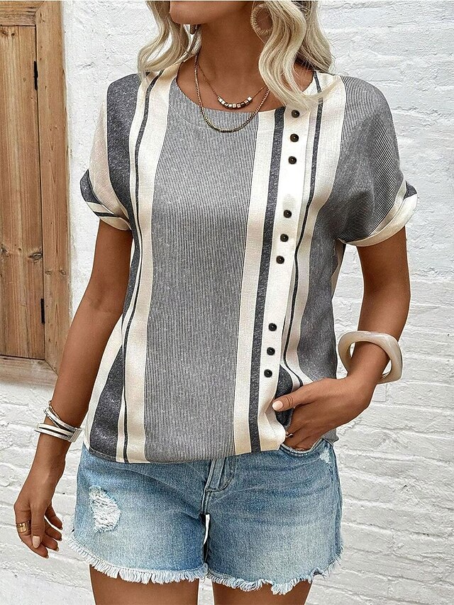 Women's Blouse Chic Striped Pattern with Button Embellishments V-neck Short Sleeve Summer Spring Casual Daily Linen prefer Wear Versatile Fit Gray Black Off-white