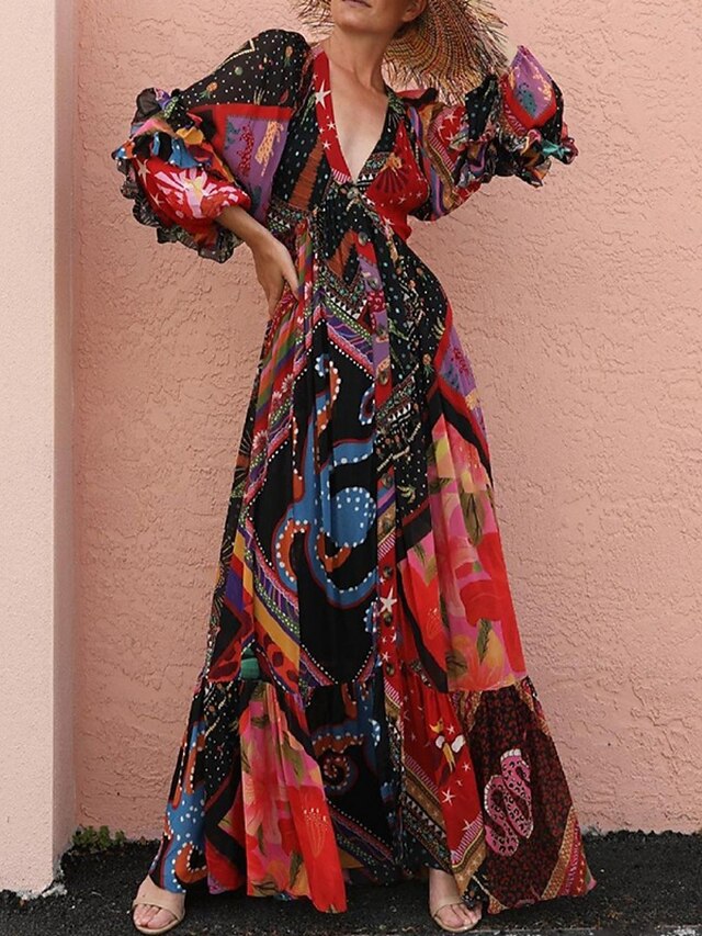 Women's Color Block V Neck Maxi Dress Long Sleeve Summer Spring 1
