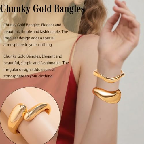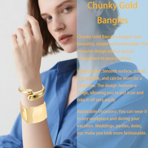 Material: Alloy SteelMetal type: Alloy SteelClasp type: Spring RingGem type: AmberPackaging Content: Four shapes Chunky Gold Bangles, You can make different combinationsChunky Gold Bangles: Elegant and exquisite, simple and fashionable. The irregular design adds a special atmosphere to your clothingHigh Quality: Smooth surface, sturdy and durable, and can be worn for a long time. The design features a hinge, allowing you to put it on and take it off very easilyOpening Design: The bracelet has a diameter of approximately 2.7 in and is suitable for most women. If the wrist is larger than 2.7, it may not be suitable.Applicable Occasions: You can wear it in any workplace and during your vacation. Weddings, parties, dates, etc., make you look more fashionable. Perfect for everyday use. first-class materials and excellent craftsmanship ensure long-lasting durability.