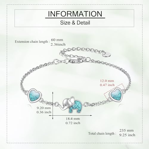 Material: SilverMetal type: Sterling SilverClasp type: Lobster ClawGem type: No gemstoneDesign Concept: Features a tiny elephant bracelet with turquoise accents, simple yet full of eleganc.Elephant heart bracelet is the perfect gift for elephant lovers and animal lovers925 Silver Elephant Bracelet: Elephant bracelet is made of first-class 925 silver, no nickel, no lead , hypoallergenic, comfortable to wear, is a good choice for allergic peopleElephant Bracelet Size: 0.72*0.36 inch. silver chain length is 7+2 inches (Adjustable). Packaging: 1 x Elephant bracelet for women, 1 x polishing cloth and 1 x exquisite jewelry boxBox Packing: Turquoise elephant bracelet is packaged in a exquisite box, suitable for Valentine's Day, Mother's Day, Thanksgiving, Christmas, birthdays and anniversaries or any other special occasions as present for lovers, family and friendsCustomer Service: 60 days after sales service, if you have any questions about elephant jewelry, we will reply you within 24 hours to solve the problem for you Perfect for everyday use. High quality materials and excellent craftsmanship ensure long-lasting durability.