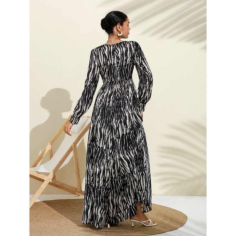 Highlights [Fabric] : Crafted from luxurious satin, this dress offers a smooth and elegant finish. The fabric's lightweight nature enhances its flowing silhouette, perfect for creating a flattering look while ensuring comfort throughout the day. [Silhouette] : The dress features a classic A-line shape that creates a timeless and sophisticated outline. Its fitted bodice cinches elegantly at the waist, flowing into a swing style that drapes beautifully to complement various body types. [Design Highlights] : This striking dress showcases a black and white abstract print, lending a up-to-date and artistic touch to its design. The V-neckline and gathered pleating add sophistication, while the long sleeves make it a versatile choice for transitional seasons. [Occasions] : Ideal for vacations, parties, and other special events, this dress seamlessly balances comfort and style. It's suitable for both casual outings and more formal gatherings, making it a versatile wardrobe staple. [Size Range] : Available in a range of sizes from S to XXL, ensuring a suitable fit for different body types. This allows customers to find the perfect size and enjoy the dress's flattering silhouette.