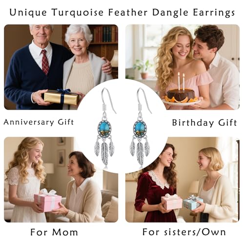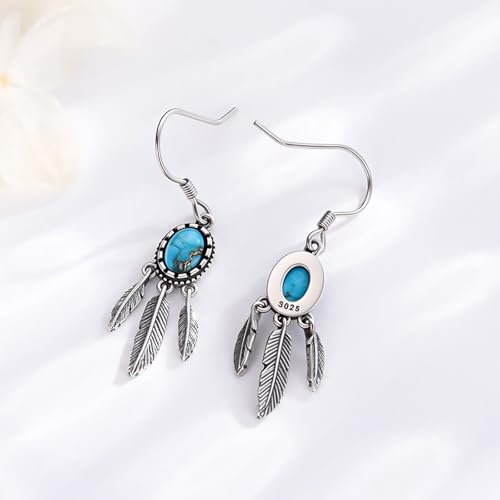 Material: Sterling SilverMetal type: SilverBack Finding: ClutchlessEarring design: DangleGem type: Turquoiseπ Turquoise Feather Earrings Design -- The combination of bohemian elegance and nature's beauty comes together in these unique earrings. Designed for the nature-loving and artistic soul, these earrings beautifully blend the vibrant allure of turquoise with the delicate grace of feathers. This combination creates a piece of jewelry that seamlessly dances between earthy charm and timeless style.π¨ Material -- The boho feather earrings is made of 925 sterling silver With natural textured turquoise, Nickel-free, Lead-free, Cadmium-free and Hypoallergenic, Especially for those with sensitive skin.π SIZE -- Turquoise Feather Earrings DesignοΌOur earrings are 23mm long and decorated with turquoise, which makes the earrings look fashion exquisite.π Elegant Jewelry Gift -- Dream catcher earrings for women.Perfect Gifts for yourself, daughter,sister, friends , wife ,business partner, on Birthday , Christmas, Thanksgiving Day, Anniversary Day,Halloween Gifts.π Our Services -- Each of our jewelry undergoes strict quality inspection before sale to ensure that customers receive the highest quality products, allowing you to buy with peace of mind. If you have any questions about jewelry, please feel free to contact us for help. Perfect for everyday use. first-class materials and excellent craftsmanship ensure long-lasting durability.