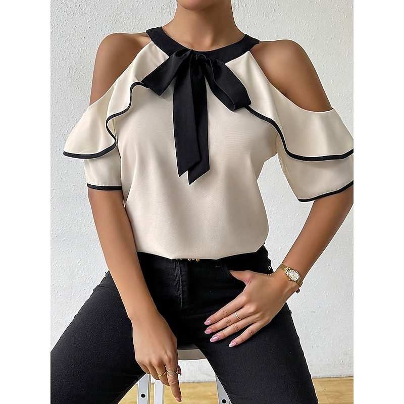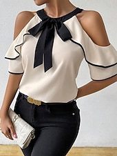 popular ! Women's Camisole Tank Top Solid Color chic Casual Short Sleeve Crew Neck Regular Tops Daily Ruffle Patchwork Beige Summer Spring