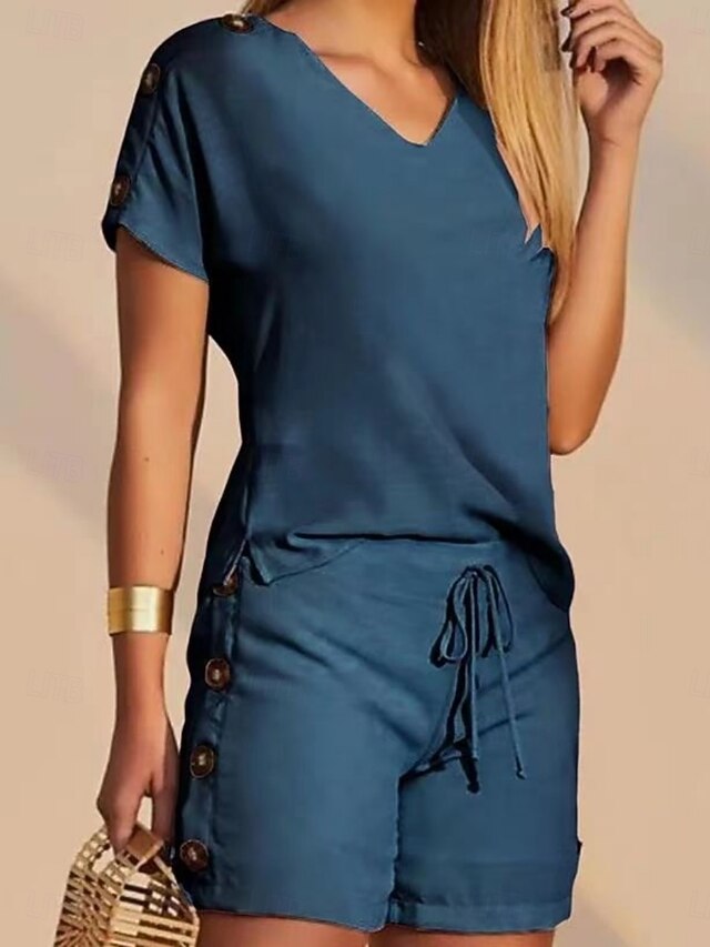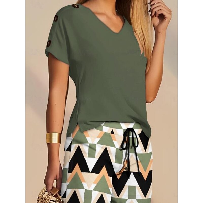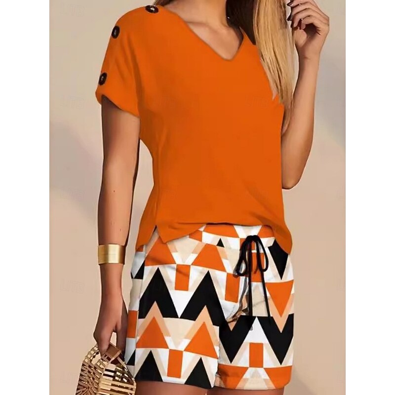 popular ! Women's 2 Pieces Fashion Streetwear Daily Shorts Sets Short Sleeve V Neck Geometric Plain Drawstring Print Casual Daily Yellow Blue Orange Summer Regular Fit