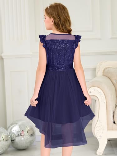 Girls Dress Ruffle Sleeve Sparkly Sequin Tulle Princess Dress for Birthday Party High Low Dress with Belt 5-14 Years
