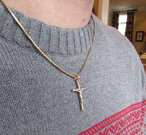• STYLE: This elegant crucifix cross pendant has great detail and style. It is made of solid gold although the tube is hollow to keep it lightweight and cushy. Wear outside your clothing or under it. If you are interested in a chain or cord, it needs to be purchased separately.