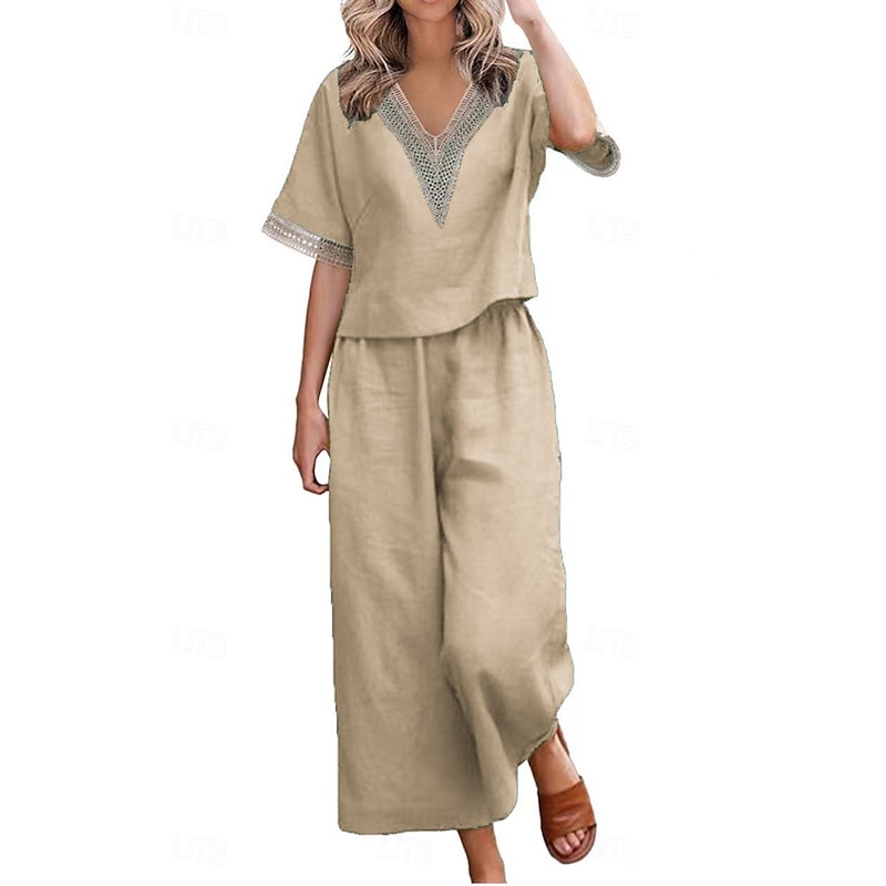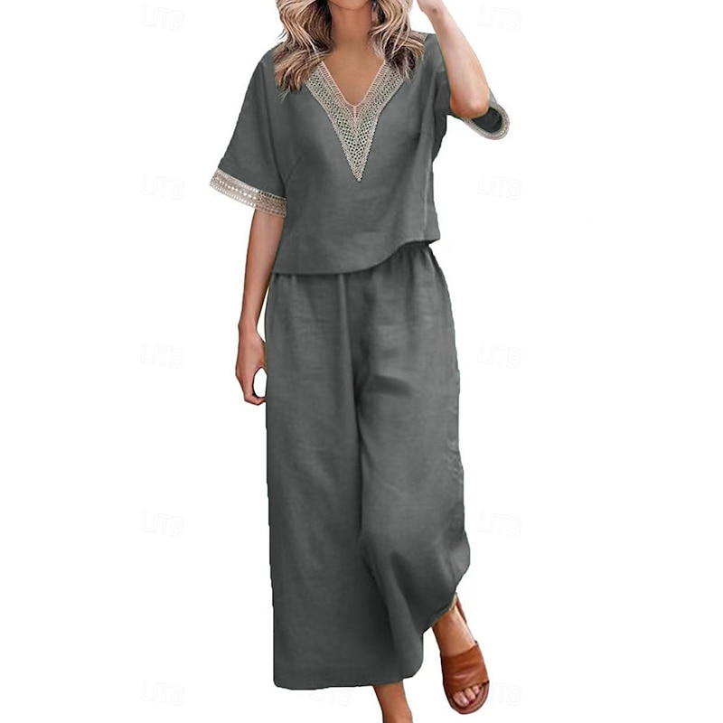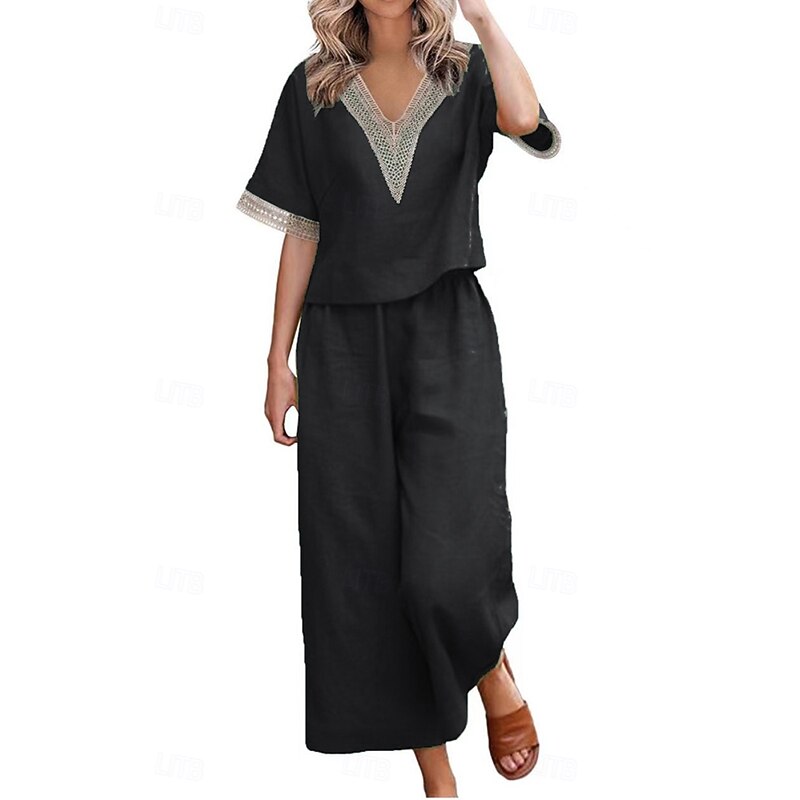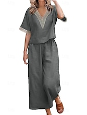 More information about Women's Active Basic Linen-Inspired Sets Two Piece Sets Blouse Half Sleeve V Neck Solid Color Patchwork Holiday Dark Grey Black Dark Navy Summer Regular Fit