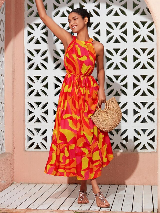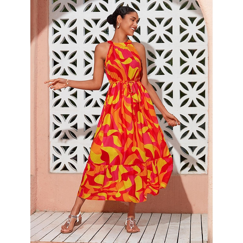 Why Choose Abstract Print Halter Neck Maxi Dress?