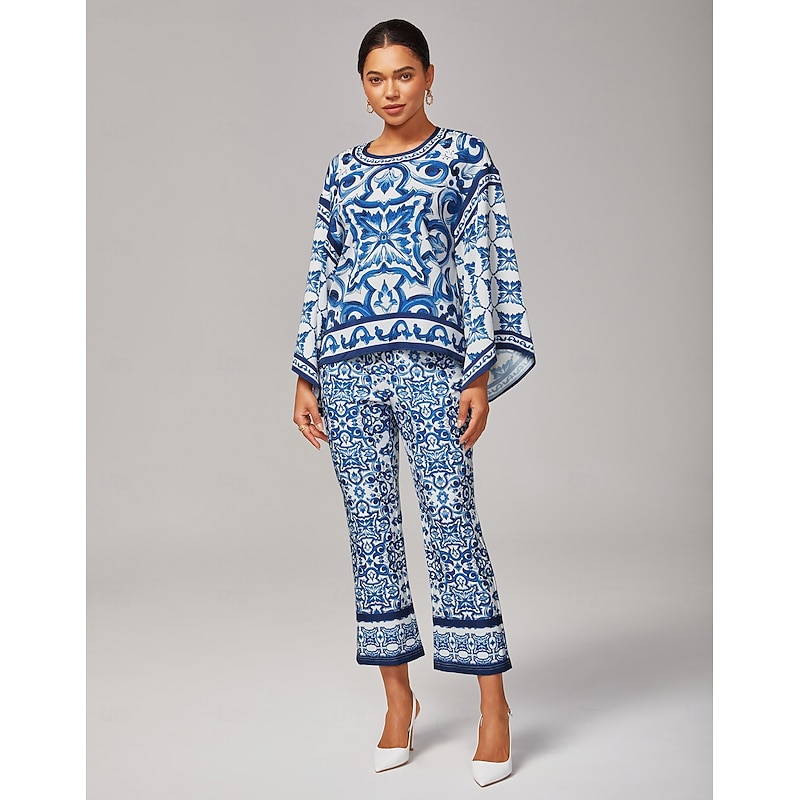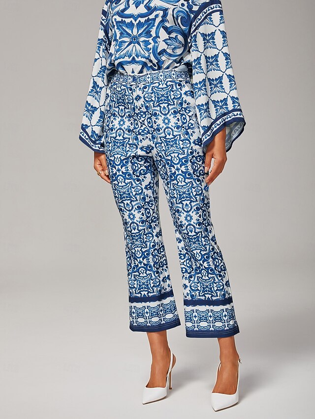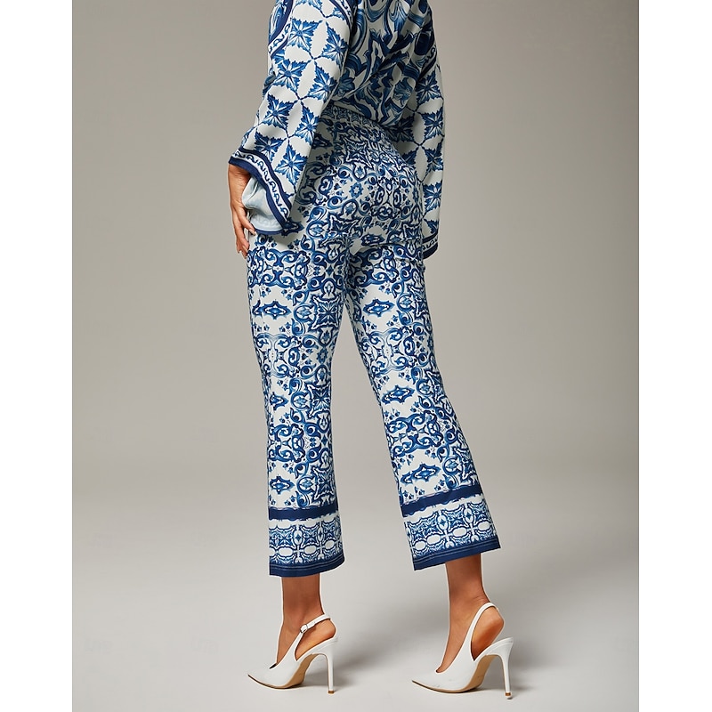 $72.99 - Women's Blue and White Porcelain Print Flare Pants Stretch Fabric Placement Print Elegant Stylish Casual Daily Fall 2025. Shop for cheap Pants online? Buy at lightinthebox.com on sale today!