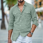 More information about Men's Shirt Linen Shirt Beach Shirt Solid Color Vacation Curise White Blue Green Khaki Long Sleeve Fold-over Collar Clothing Apparel Pocket
