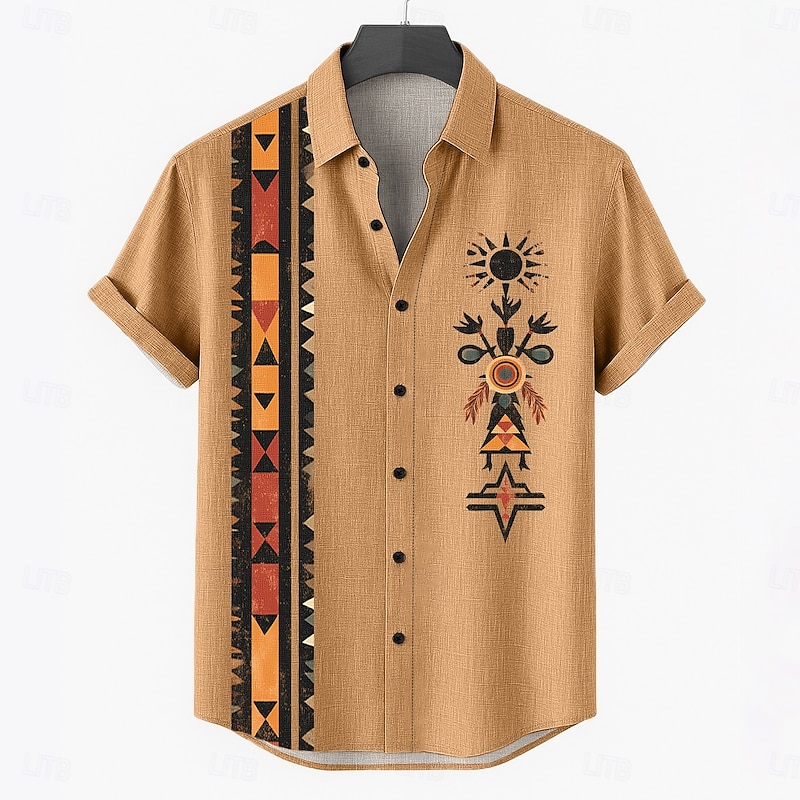 Men's Linen Shirt Summer Shirt Beach Wear Button Up Shirt Tribal Vacation Casual Brown Green Khaki Short Sleeve Turndown Summer Spring Clothing Apparel 1