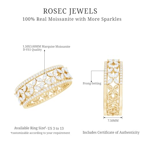 Ring size: 3Item width: 2.2 millimetersMaterial: 10K Solid Gold, MoissaniteMetal type: White GoldMetal weight: 3.8 gGem type: MoissaniteFor the bride who blooms with love, this Flower Wedding Band is a delicate embrace of nature's charm. With petals that dance in the light, it captures the essence of your romance, a love that blossoms more beautifully with every passing day.Complimentary Gift For You - Pair of Sterling Silver Half Carat Moissanite Earrings with No Cost.Quality Assurance- 10K Solid Gold; Moissanite Quality: D-vs1 ; Total Moissanite Carat : 1.34 (Approx.)Certified Moissanite with Perfect Sparkle - We make sure to select the best grade Moissanite for you which is D Color VS1 Clarity that brings out the stone's fire and brilliance at it's best.Safe and Secure Packaging - All of our jewelry items arrive in high-end signature jewelry boxes, ensuring they are ready for proposals/gifting purposes so that you don't have to spend any time packing them. To assist you in avoiding unnecessary hassle, we provide our ring sizing kit to you.Shop with Confidence - Rosec Jewels assures to get peoples head turn with our sparkling jewelry pieces that comes with Certificate of Authenticity just for your peace of mind. sku:-RCRI052184234 Perfect for everyday use. High quality materials and excellent craftsmanship ensure long-lasting durability.