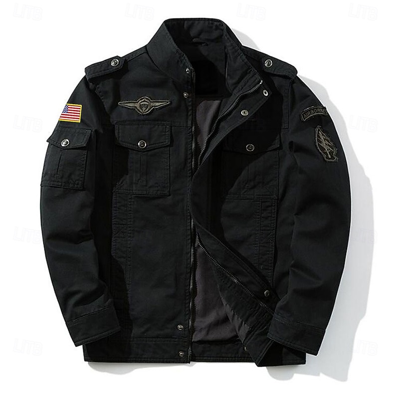 Highlights [Fabric] : Crafted from durable, high-quality cotton, this men's jacket promises both comfort and breathability, making it ideal for fall and winter seasons. [Silhouette] : The regular fit of this jacket ensures a pleasant yet tailored appearance, suitable for daily and outdoor wear. [Design Highlights] : Featuring a military-inspired aesthetic, this jacket is adorned with embroidered tactical patches, a standing collar, and a zip front closure with sturdy buttons for a robust look. The design includes multiple functional pockets, such as two chest pockets with flaps and button closures, as well as sleeve pockets for added practicality. Button-adjustable cuffs provide a customized fit, while the inner lining adds warmth. [Occasions] : Perfect for sports, outdoor activities, or casual daily wear, this jacket combines utility with a timeless style, suitable for a variety of settings. [Size] : Available in sizes S, M, L, XL, and 2XL, accommodating a wide range of body types. The jacket is offered in versatile colors including black, army green, and khaki to suit different preferences.