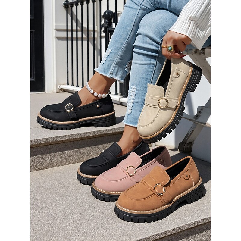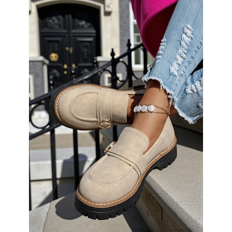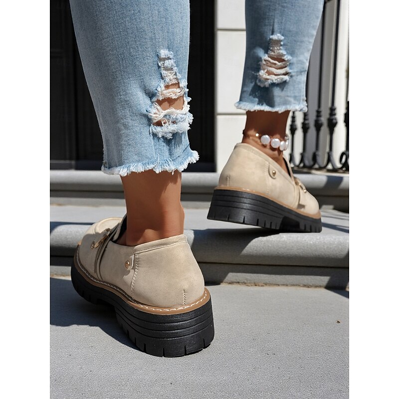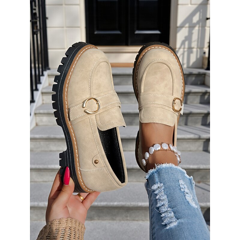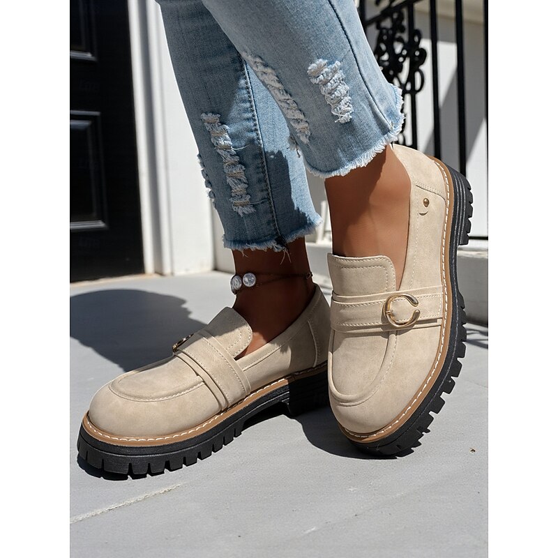 Why Choose Women's Beige Suede Lug Sole Loafers – Casual Slip-On Platform Shoes with Gold Buckle for Work, Travel, and Weekend Outfits?